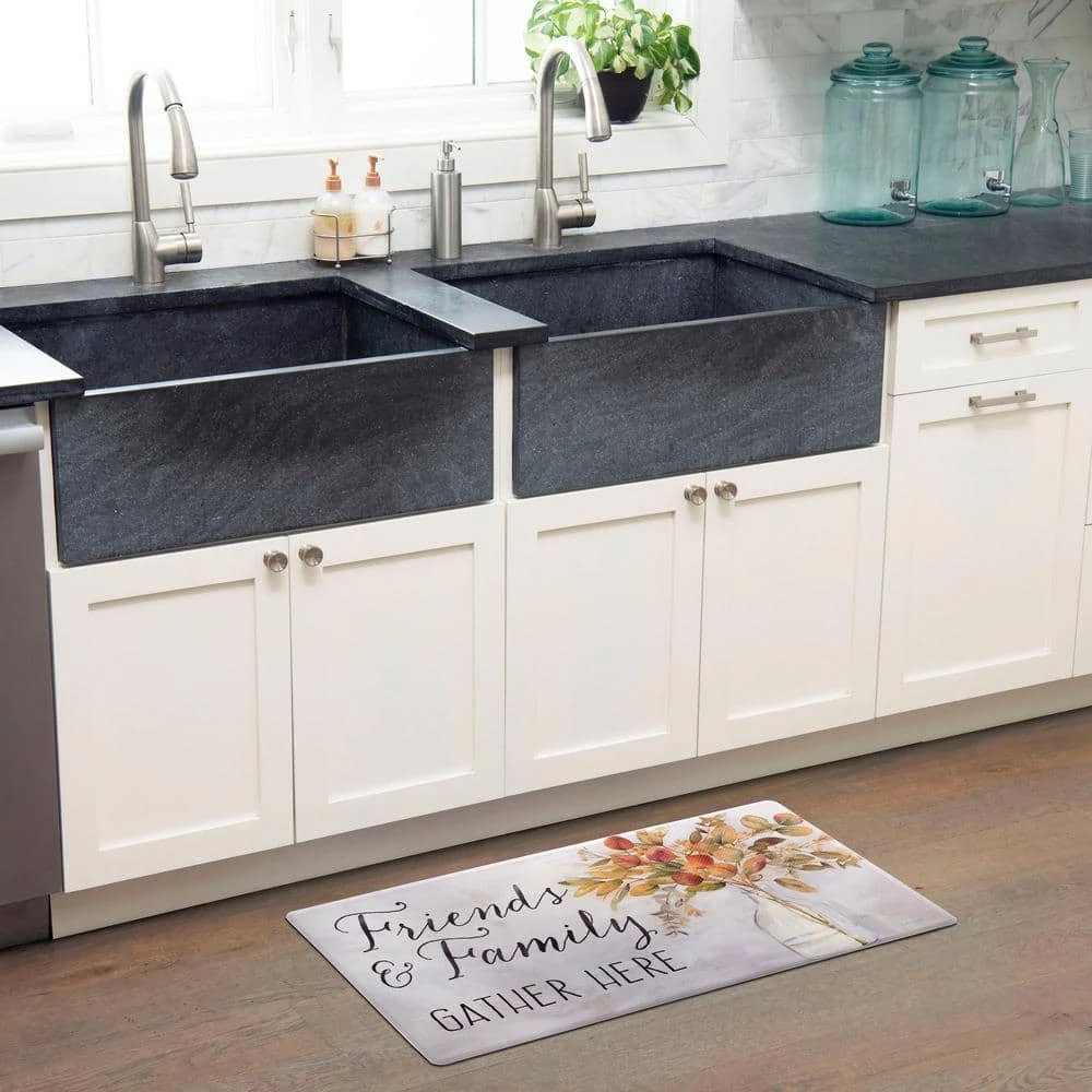 Brighten up your cooking experience with the Cozy Living Friends and Family Gather Here kitchen mat by SoHome. Boosting a eucalyptus leaves design with farmhouse flair that will bring a warm and welcoming feel to your home decor. This anti-fatigue kitchen mat will provide long-lasting comfort while you perform your daily tasks. Finished with a beautifully embossed textured top, these mats are constructed of durable polyvinyl with a smooth beveled edge that provides a safe, secure and anti-slip surface.