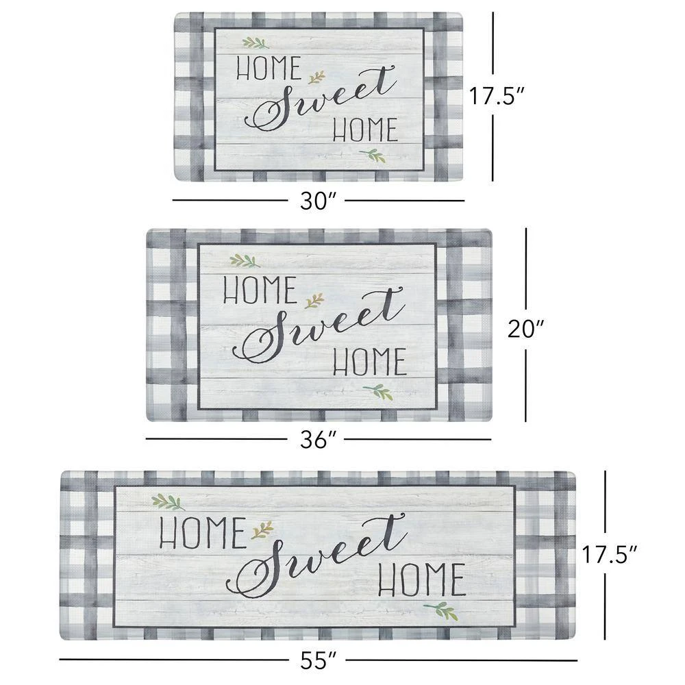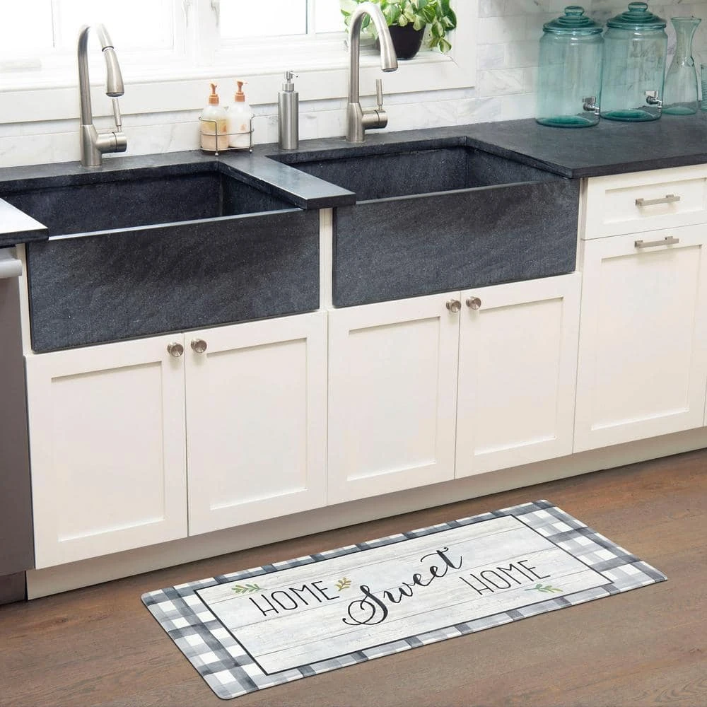 Bring comfort and style to your kitchen decor with the Cozy Living Home Sweet Home Farmhouse kitchen mat by Home Dynamix. Featuring a family friendly word saying on checkered background that is perfect for your farmhouse decor. This anti-fatigue mat will provide long-lasting comfort while you perform your tasks. Finished with a beautifully embossed textured top, these mats are constructed of durable polyvinyl with a smooth beveled edge that provides a safe and secure, anti-slip surface.
