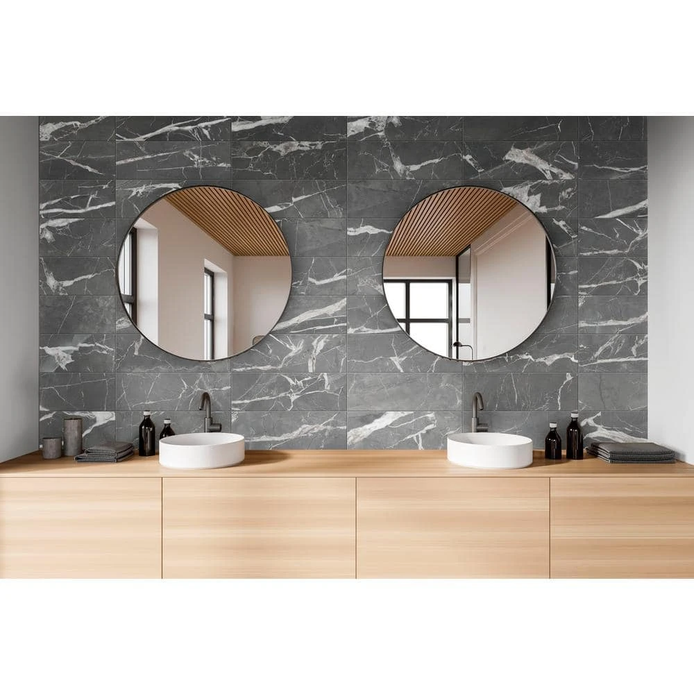 The LuxeCraft Calacatta Black 8 in. x 24 in. wall tile creates a stunning design statement. The color contrast between the white veining and black base of the tile is a beautiful visual. This large-format subway tile is complete with a polished finish making it a beautiful product to use on kitchen and bathroom walls and backsplashes.