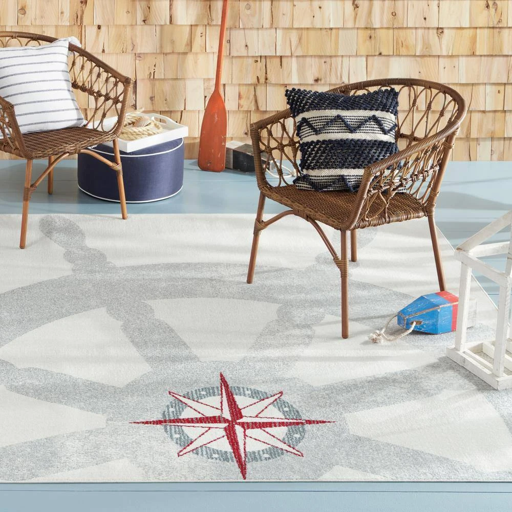 The Marine Helm Area Rug from Home Dynamix brings cool, relaxed, coastal style into your indoor or outdoor space with its large boat helm and navigational star graphics in shades of grey, red, and blue on a cream ground. Machine-woven in a low pile with polypropylene, this indoor/outdoor area rug is stain and fade-resistant and durable enough to handle the elements. The soft pile offers cozy comfort underfoot, and the marine-inspired design brings a calm, welcoming feel into your living space. Made in Turkey.