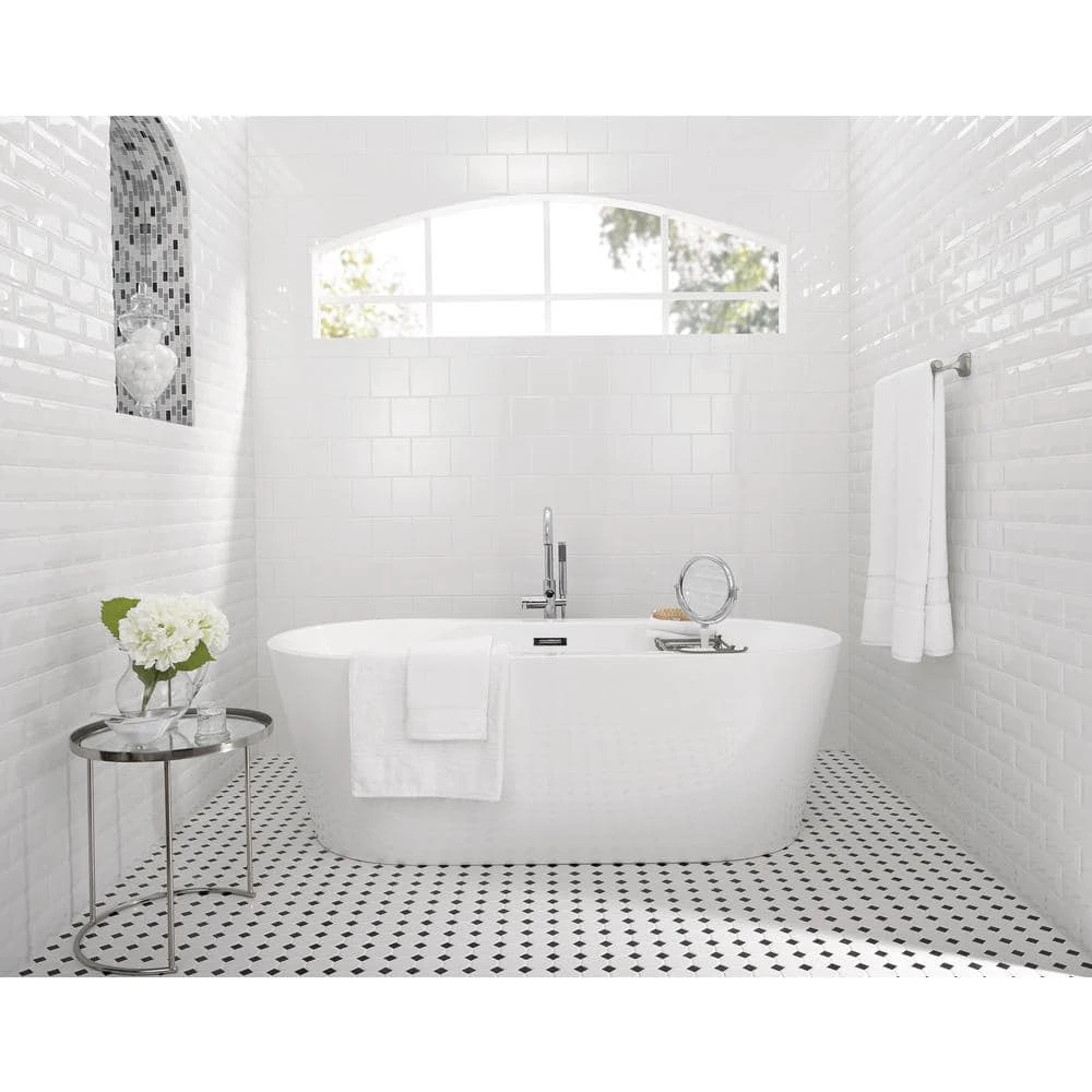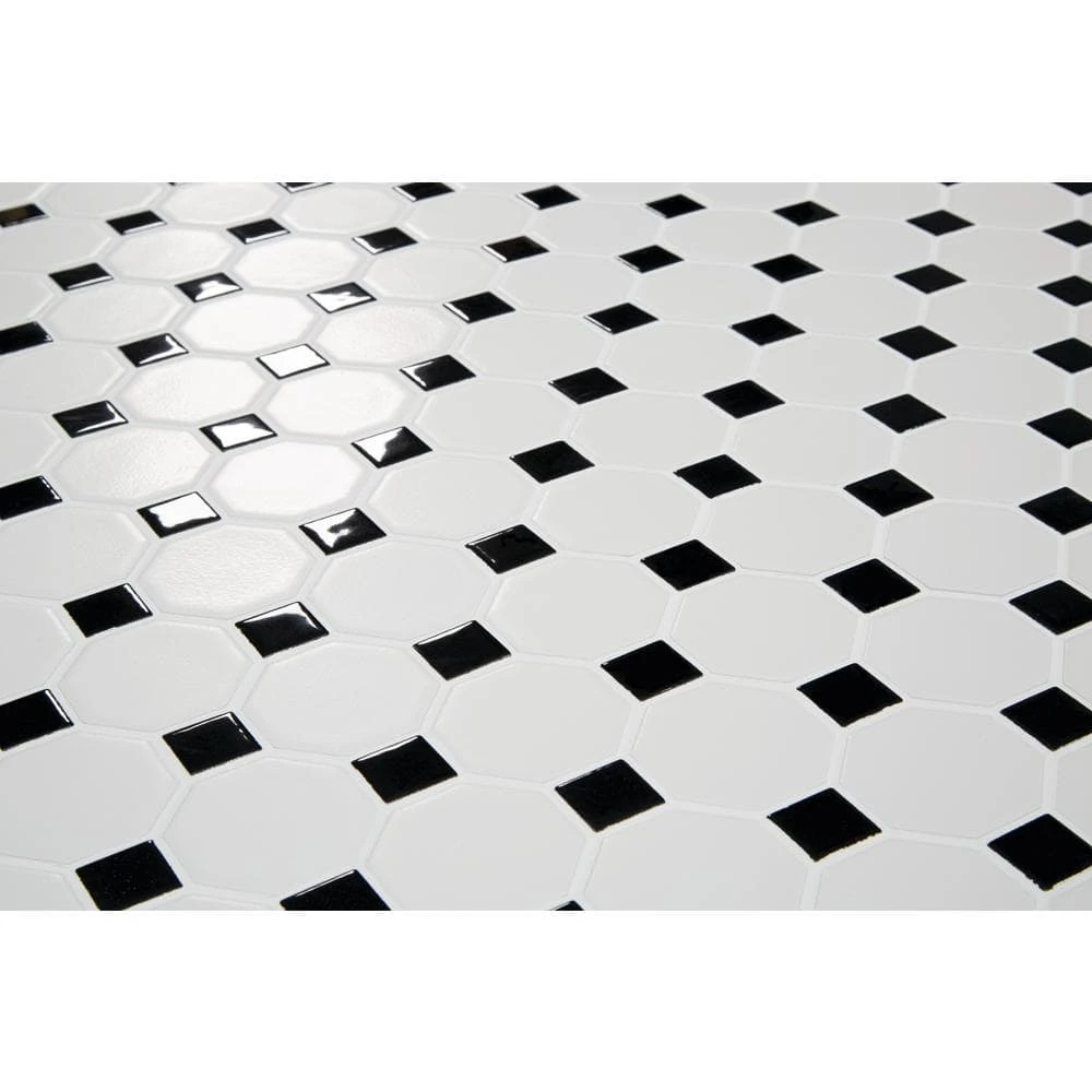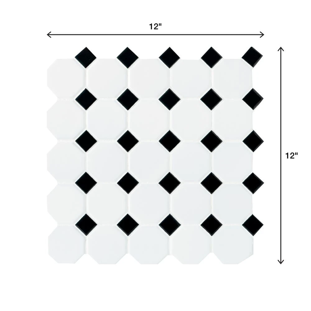 Incorporating a pattern that lends timeless style to any space, the Daltile Matte White with Black Dot Ceramic Mosaic Tile is ideal for remodeling projects, an especially classic choice for bathroom upgrades. This tile features 2 in. x 2 in. white octagons with 1 in. x 1 in. black dots and comes in a pre-formatted sheet to help ensure ease of installation. Suitable for both indoor and outdoor applications, like pool linings, in non-freezing environments.