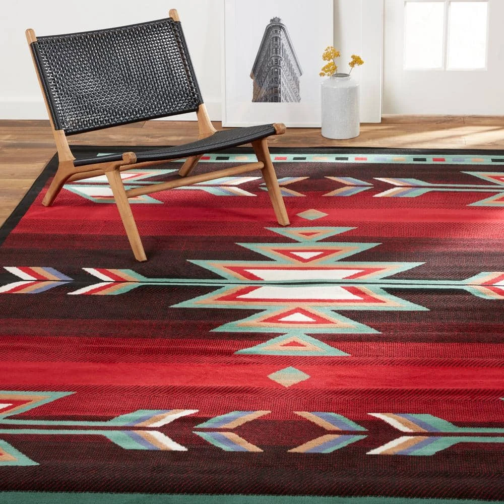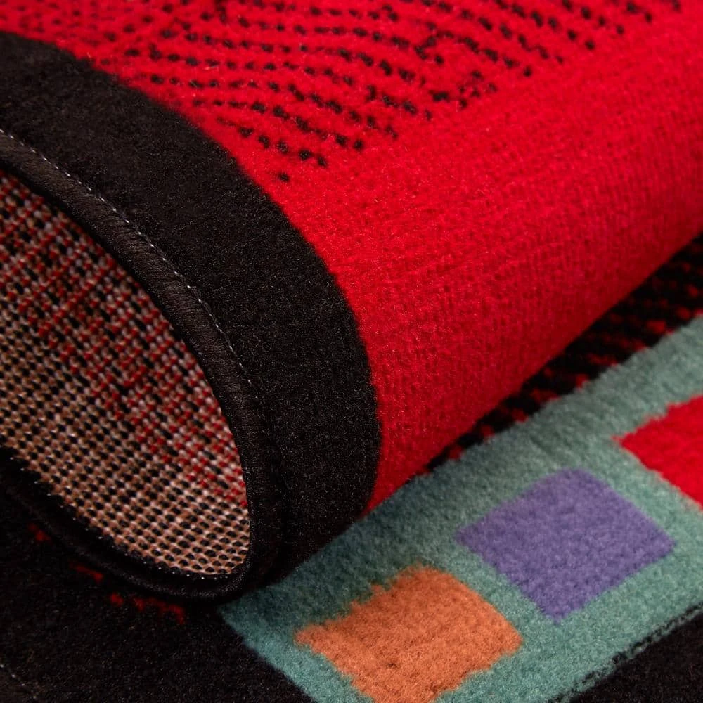 Add a taste of the Southwest to your home decor with the Premium Sagrada rug collection by Home Dynamix. Showcasing a Navajo-inspired design, this vibrant rug features traditional motifs in an eye-catching array of colors on a black and red ground. Machine woven from soft polypropylene yarns, the cut pile feels cozy underfoot. These rugs are stain and fade resistant and will withstand day-to-day wear, even in high traffic areas. A durable jute backing helps the rugs keep their shape and beauty.